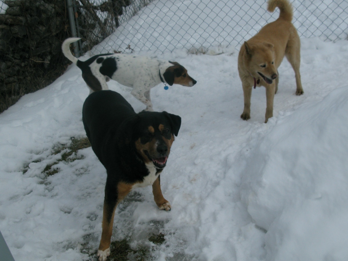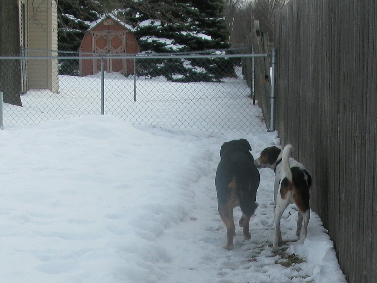 Once I brought her home we did laps around the snow path around our backyard. She had the instinct to follow me around and looked much more comfortable outside. The neighbor dog "The Brown Roamer" escaped during our first session so they got to meet.