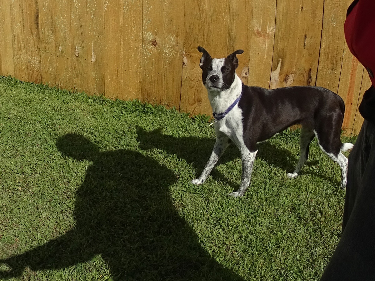Three months later we got to watch Shadow over the weekend while her owner went out of town. It was wonderful to see how she had bonded with him, plus to learn that she got to go on 3 miles runs. Once she was in the backyard I started doing laps and she dutifully walked next to me the whole time. Yup, we picked a very good name for her.